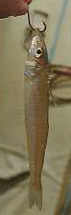 船釣りを中心によく使われるエサです。春、生きたイカナゴが手に入るとき瀬戸内海ではメバル・アイナメ・クロソイ・マダイ釣りによく使われます。口掛けか目刺しが一般的です。冷凍ものはカサゴ釣りのエサによく使われます。 |