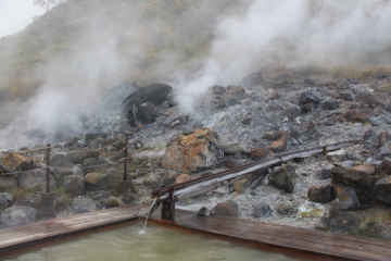 宿を出て少し下った所に蒸気がもうもうと立ち上っている野天風呂があります。 混浴風呂、男湯、女湯、蒸し風呂が点在しています。 そのどれもが蒸気の中にあり、周囲は八幡平の樹海の中です。 湯舟はここも木造りで、やさしい味わいがありました。 良かったですよ。ほんとにいい温泉でした。 |