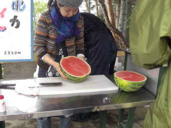 | 大天井岳と直下に建つ大天荘 | 合戦小屋名物のスイカ売場 | |