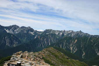 | 常念岳山頂は岩礫の上 | 常念岳山頂から槍・穂高を一望する | |