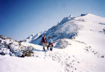 2日目 朝、晴天。新雪が積もって、雪の山は美しい。 冬山を登るのは初めてだった。 持って来たアイゼンを付けて西穂独標(2701m)まで登った。 山頂から雪の北アルプスを、西から眺めた。 ほかの2人はアイゼンを付けていなかった。新雪では必要ないらしい。 雪にはアイゼンと思い込んでいた、不慣れな冬山初体験でした。 |