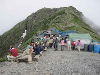 | 2日目ーーー白峰三山を縦走しますーーー 今日の日の出は4:50なので、4時過ぎには朝食を済ませて外に出ました。 雲海の端がだんだん明るく美しく輝いて、鳳凰三山の観音岳の上あたりから昇ってきます。 神々しく輝く様を、カメラに収め、手を合わせ祈ります。 そして北岳山頂を目ざして出発しました。 急な登りも一晩休むともう平気で、50分で北岳山頂(3192m)に着きました。 南アルプスの山々がすぐそこに一望出来ます。 遠く槍ヶ岳も見えました。 山の名前を教えあったり、記念写真を撮りあったり、山頂は人の声と笑顔にあふれます。 下りはかなり急で、途中クサリ場もありましたが難なく北岳山荘に到着し、ここで休憩しました。 ポカリ500mlを買ったら400円でしたが、山では普通です。 冷たいのが嬉しいですね。 そして3000mが2キロにわたって続くこの縦走路の魅力、雲上の散歩に出発しました。 日差しは強いですが、涼しい山歩きです。 朝眼下に広がっていた雲海がしだいに上の方にあがってくるのでしょうか、まわりの山々はガスに覆われるようになってきました。 中白根山も間ノ岳でも展望には恵まれませんでした。 それでも農鳥小屋への縦走路では、雲もさらに上にあがってまた展望が楽しめるようになりました。 そして農鳥小屋には13:00に到着。 ここでは群馬の夫婦の向かいになりました。 2人は300名山を目指しているそうで、次は北海道に行くそうです。 300名山をまとめて登るというのですね。 隣は奈良から来た女性3人組でした。 小屋の臭いが気になるらしく、バンダナを折ってマスクのように鼻と口を覆っていました。 トイレがまた大騒ぎでした。 なにしろここのトイレときたら下は吹き抜けで、波型トタン板が斜めに立てかけてあり、天然の垂れ流し状態! 彼女達は、いろいろあるほうが想い出に残ると、もう楽しんでいるふうでした。 |