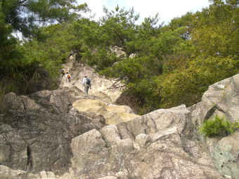 | 阪急芦屋川で下車。芦屋川沿いを歩いて、住宅街を抜けると滝の茶屋に来る。 ここから登りが始まり、高座の滝を左へ行くと、すぐに岩場となる。 ロックガーデンの岩尾根の急登も慣れると楽しいものだ。 岩に手をのばして、よつんばいになって登る。 風吹岩まで来ると、大都会の大展望が楽しめる。 ここからはすこし緩やかになって、登山道の脇のあちこちに、イノシシが土を掘り返した跡がある。 水浴びをしたり、餌を探した跡のようだ。 そしてゴルフ場をぬけ、雨ヶ峠を通り、一軒茶屋へと歩くとドライブウェイに出た。 道路を横断し、10分ほど登ると六甲山最高峰(931m)に着いた。 山頂は広く、まわりの木々に山グミがいっぱい実をつけていた。 いいデザートがあった!食べるとなかなか美味しい。 下山は魚屋道(ととやみち)を有馬へ下る。 かって灘漁港から有馬へ魚を運んだ道だということだ。 |
