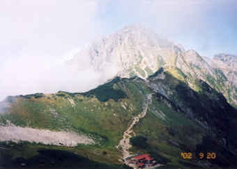 | 先の10人位のグループは装備を整え、北方稜線ルートへ下って 行った。 熟練者しか進めないコースだ。 リーダーさんのさっきの言葉の意味が分かった。 傍にいた若い男性が「あの人達はどこへ行くんだよー」と大きな声で言った。 眼下には赤い屋根の小屋が見えていた。 「あそこに見える赤い屋根の小屋の方へ下るんでしょうねぇ」 「あっほんとだ。すごいなー」 一緒に下を眺めて、会話した。 小屋は池ノ平小屋と思われる。本格登山の人達だった。 下りのカニのヨコバイはちょっと怖かった。 最初の一歩と、鎖が終わって鉄ハシゴに移る時だ。 そこを過ぎるとあとは岩にも慣れてきた。 小屋に戻ると、若いカップルが待っていてくれた。 いい山だった。岩の殿堂を満喫して、岩山が好きになった。 |