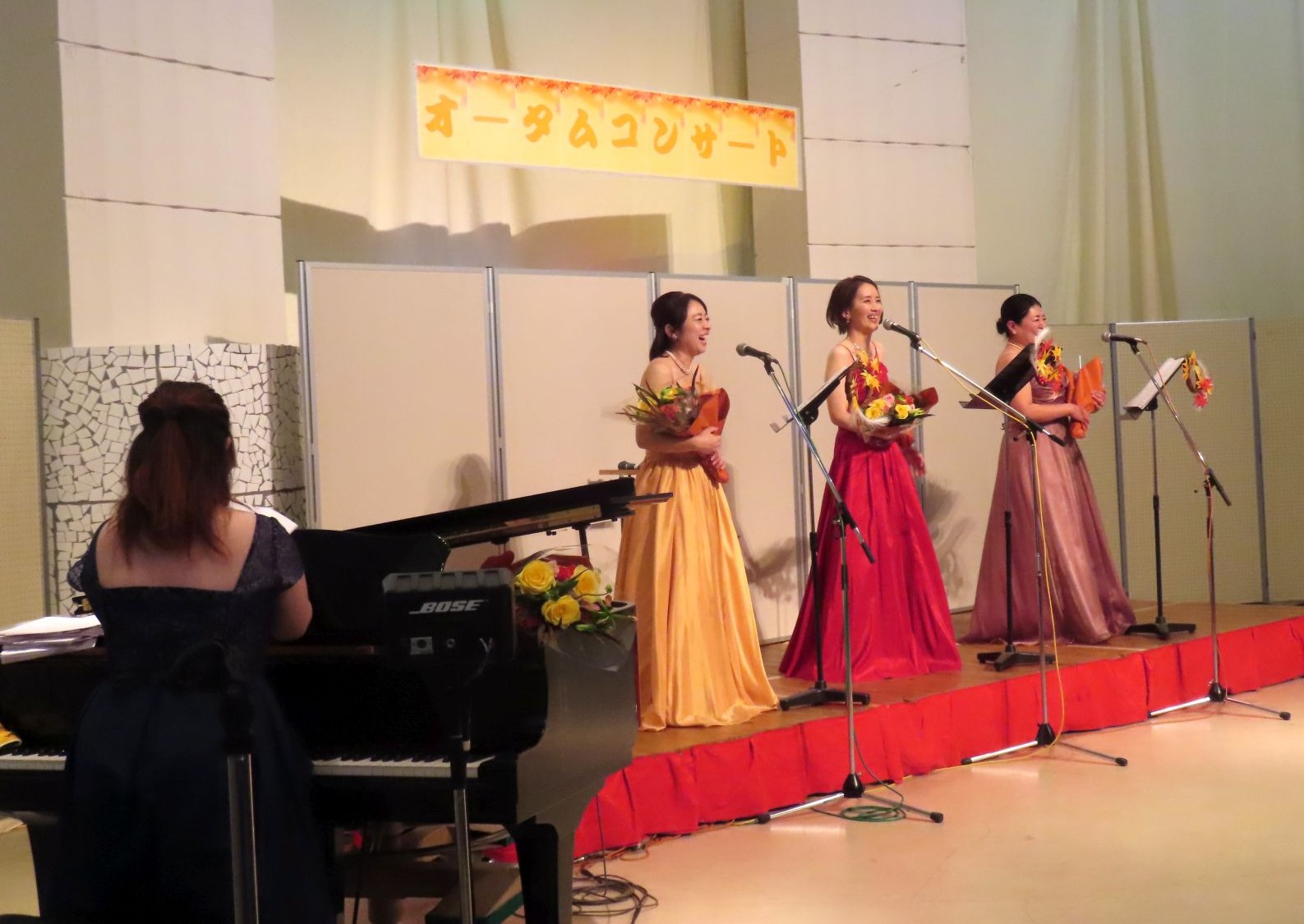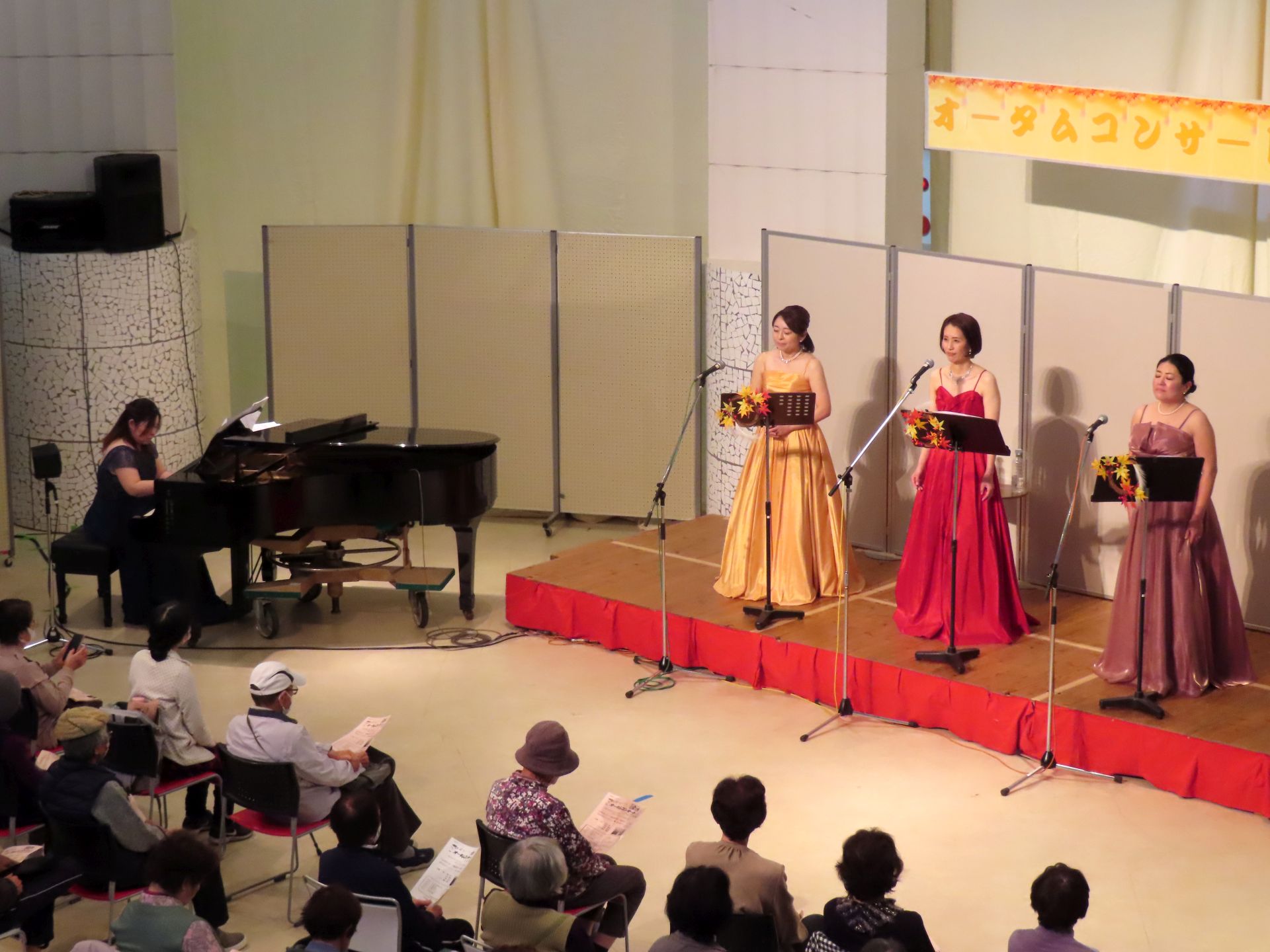 オータムコンサート 11月30日(日) オータムコンサートコンサートを開催しました。 出演は、サンシティホールで歌の講座を担当していただいている河田先生とそのご友人の方々で、秋の歌や懐かしの歌の数々を披露していただきました。のびやかで、美しい歌声やピアノ演奏に会場の皆さまもうっとり聴き入っている様子でした。途中出演者と会場の皆様が一緒にうたう機会もあり、たのしいコンサートになりました。